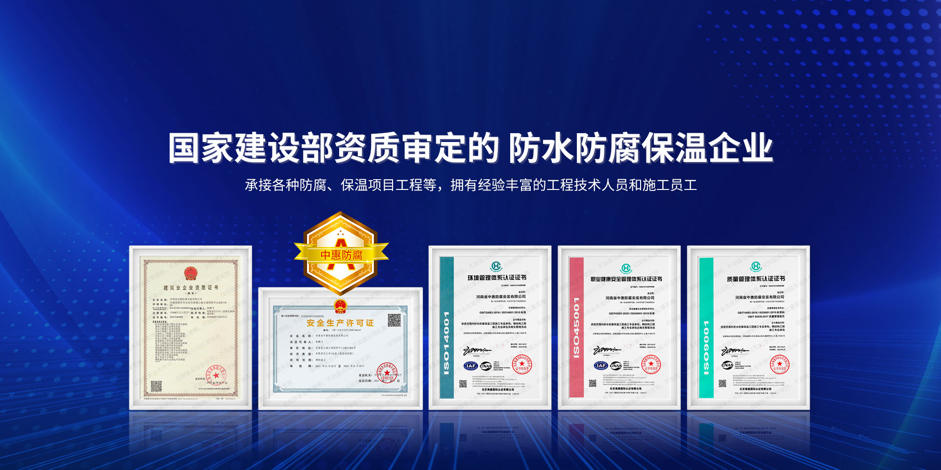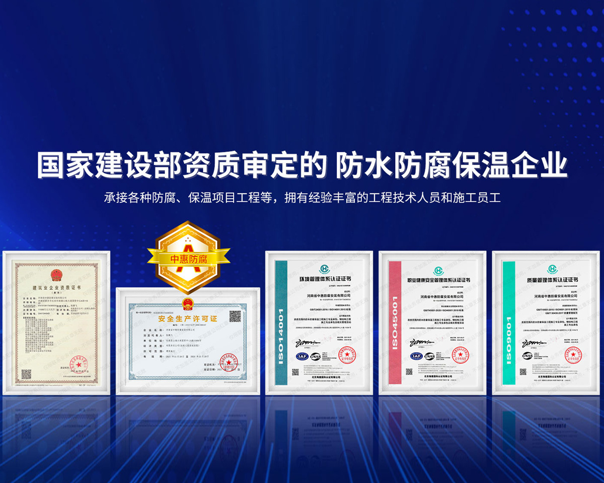 公司經營范圍:防水防腐保溫工程;消防設施工程;建筑裝修裝飾工程;建筑機電安裝工程;電力工程;建筑工程;石油化工工程;工業清洗工程;油罐清洗工程;鋼結構工程;環保工程;模板腳手架工程;電纜防火封堵、防污閃噴涂、外墻外保溫工程;各類施工勞務作業;設備維修、船舶鉚焊、涂裝;電力工程材料、建材、防水材料、防火材料、防腐保溫材料銷售,并相繼通過了GB/T19001-2008idtISO9001:2008GB/T50430-2007質量管理體系認證證書。GB/T24001-2004idtISO14001:2004環境管理體系認證證書。GB/T28001-2011idtOHSAS18001:2007職業健康安全管理體系認證證書。公司是中國防腐蝕于防護協會、中國施工企業管理協會、電力協會和中國鋼結構防水協會會員單位。 公司的經營業務涵蓋了石油、化工、電力、冶金、煤炭、船舶、國防、燃氣、水利、環保、交通運輸、航空及國防軍工和輕紡市政等行業的防腐保溫絕熱設備。鋼結構安裝、防火、防水、金屬噴鍍、聚脲噴繪、陰極保護、防滲透堵漏、玻璃鋼及各種磚版材料襯里、橡膠襯里、煙氣硫和耐酸溶劑腐蝕等工程施工。公司連續十年榮獲“省市先進施工企業”“安全生產先進單位”“重合同,守信用企業”和“AA***資質企業”的稱號。2000年被命名為市級文明單位,2002年被國家工商行政管理局命名為“重合同,守信用的企業”、被中國工業防腐蝕技術協會命名為“防腐蝕企業,能源節約及環境保護領域有豐富的經驗和***的業績。工程一次交驗合格率100%。其中攀枝花鋼鐵公司煉鐵廠四號高爐及熱風爐防腐工程、上海寶鋼公司煤氣柜防腐工程、撫順石油一廠裝置防腐項目、齊魯石化公司稀烴廠高塔防腐工程、吉林化學工業公司煉油廠油罐防腐工程、天津石化熱電廠六號爐頂棚聯絡管保溫工程、大慶油田(太倉)力神泵業工程、中國化學工程第十一建設工程、中原油田勘探局工程、中國石化銷售有限公司華北分部、魯皖輸油管道工程、貴州開磷息烽合成氨工程、陜西黃陵煤化工程、中國石油天然氣西部管道塔里木輸油工程、邯鋼集團邯寶鋼鐵公司煉鐵工程、德州供電工程、吉寶(南通)船廠工程,偃師華潤熱力工程、鄭州熱力總公司。 河南省中惠防腐安裝有限公司愿以豐富的施工經驗,***的技術,***的設備,***的管理,***的服務,竭誠為國內外廣大的用戶提供***滿意、******的工程作品。 我公司愿與國內外同仁一道,團結協作,共同推進防腐蝕行業發展! 公司地址:河南省長垣縣建設路北段360號 固定電話:0373-8866488 郵編:453400 網址:http://www_zhff_com_cn.guguvip.com